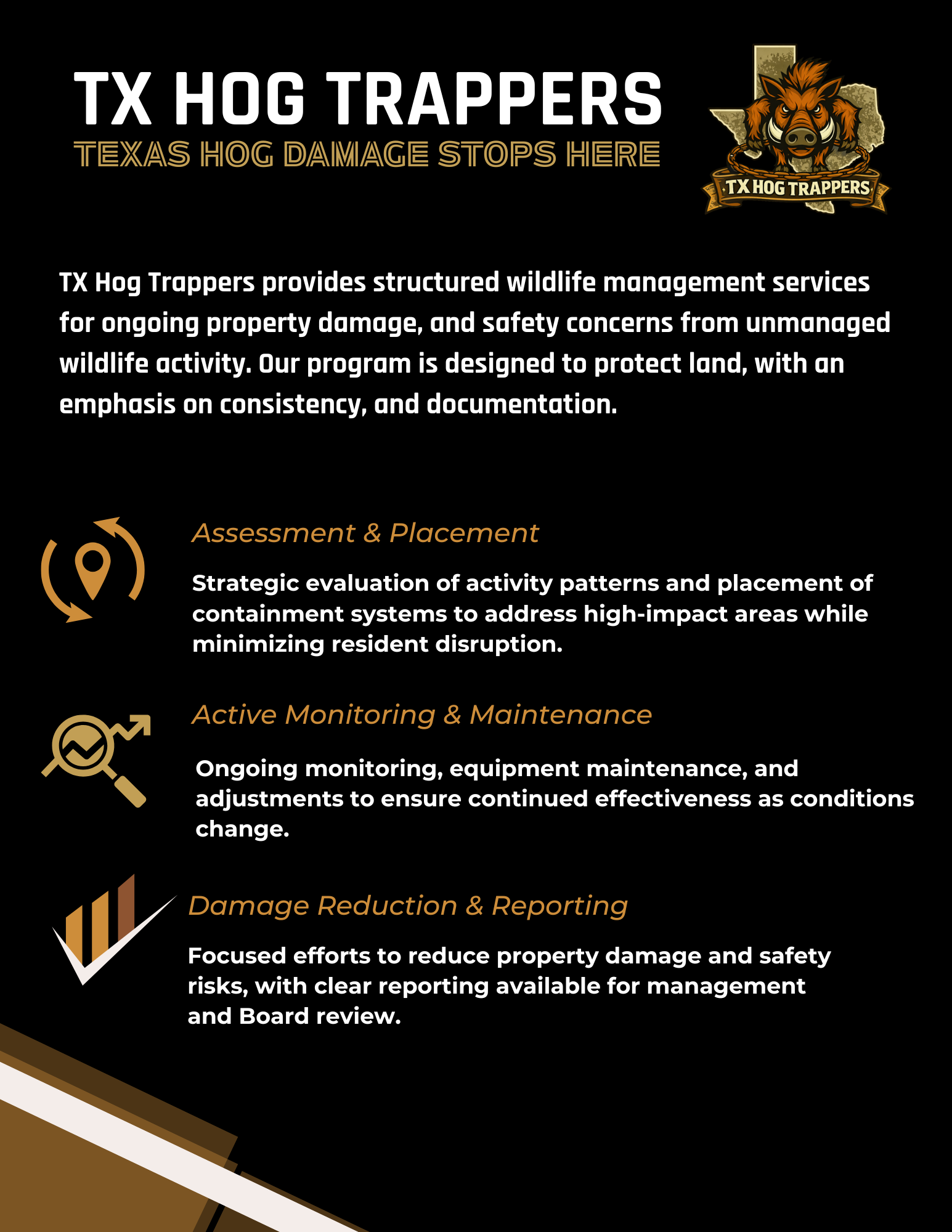 Operational Reporting Regular updates summarizing trap activity, removals, and site observations.